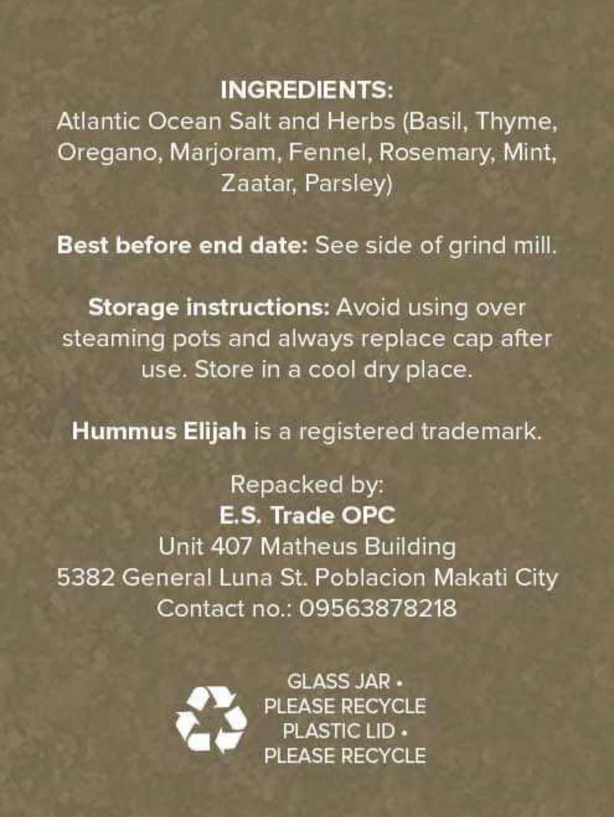 Atlantic Ocean Salt, Herbs & Spices: Basil, Thyme, Oregano, Marjoram, Fennel, Rosemary, Mint, Zaatar, Parsley